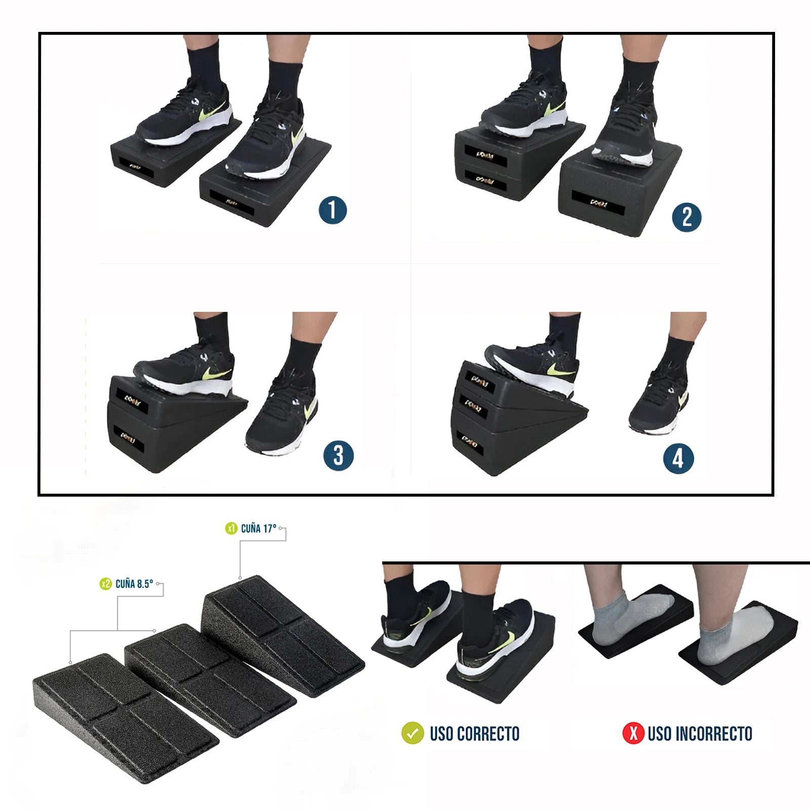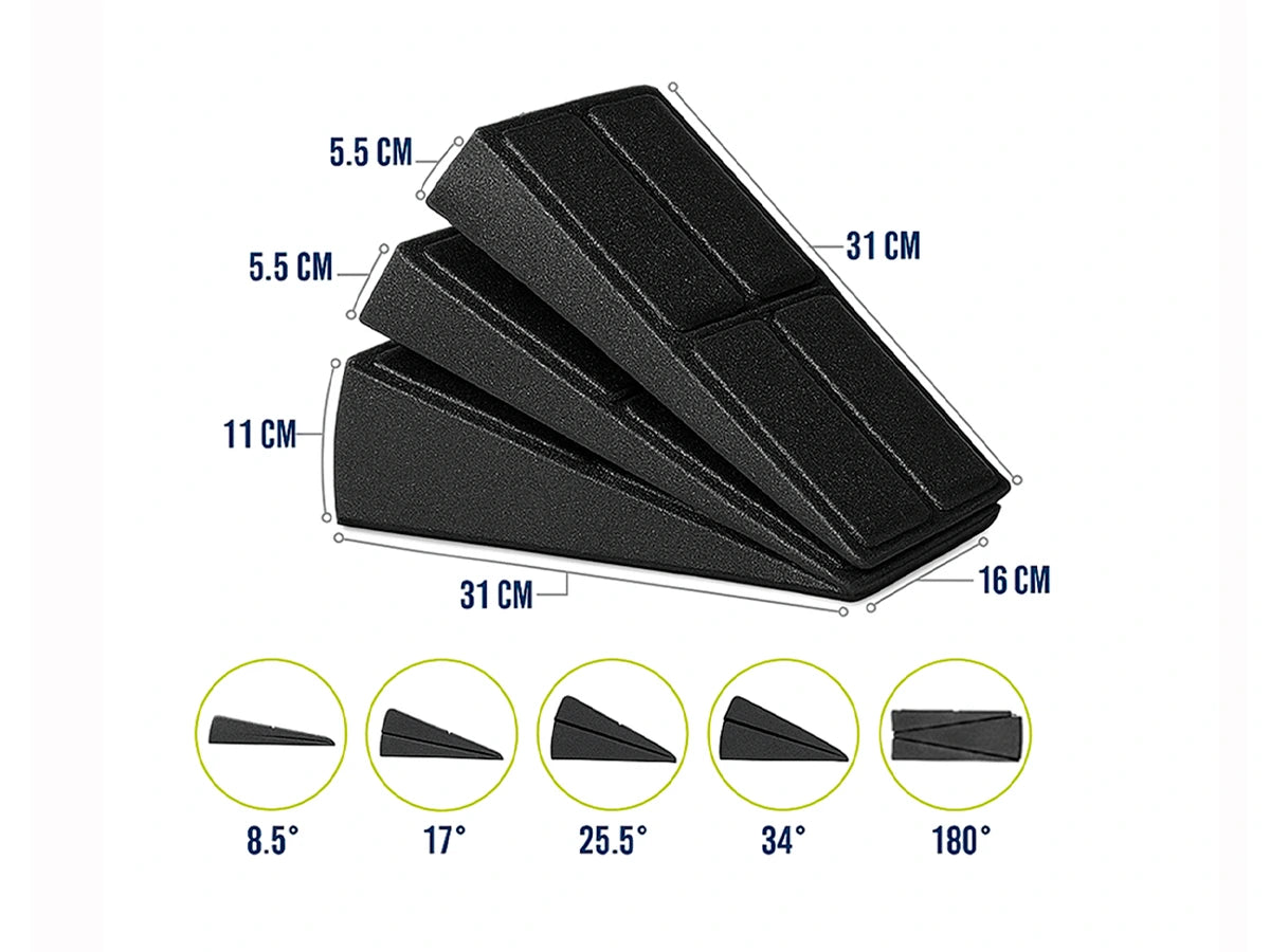 - Las cuñas están fabricadas con material EPP no tóxico, ligero (0.9 lb) y duradero, que soporta hasta 500 lb. El diseño antideslizante y apilable (4 ángulos) permite ajustar la altura para mejorar la estabilidad y profundizar sentadillas. Son portátiles y multiusos, ideales para optimizar el enfoque en cuádriceps y glúteos, además de ser útiles para yoga, estiramientos y terapia.