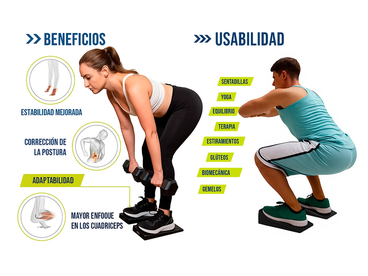 El producto es una herramienta multipropósito y adaptable que mejora la estabilidad y corrige la postura, reduciendo el estrés en las articulaciones. Su uso optimiza el rendimiento al aumentar la profundidad de la sentadilla y lograr una mayor activación de glúteos y enfoque en cuádriceps. Es ideal para diversas actividades como sentadillas, yoga, terapia y estiramientos.