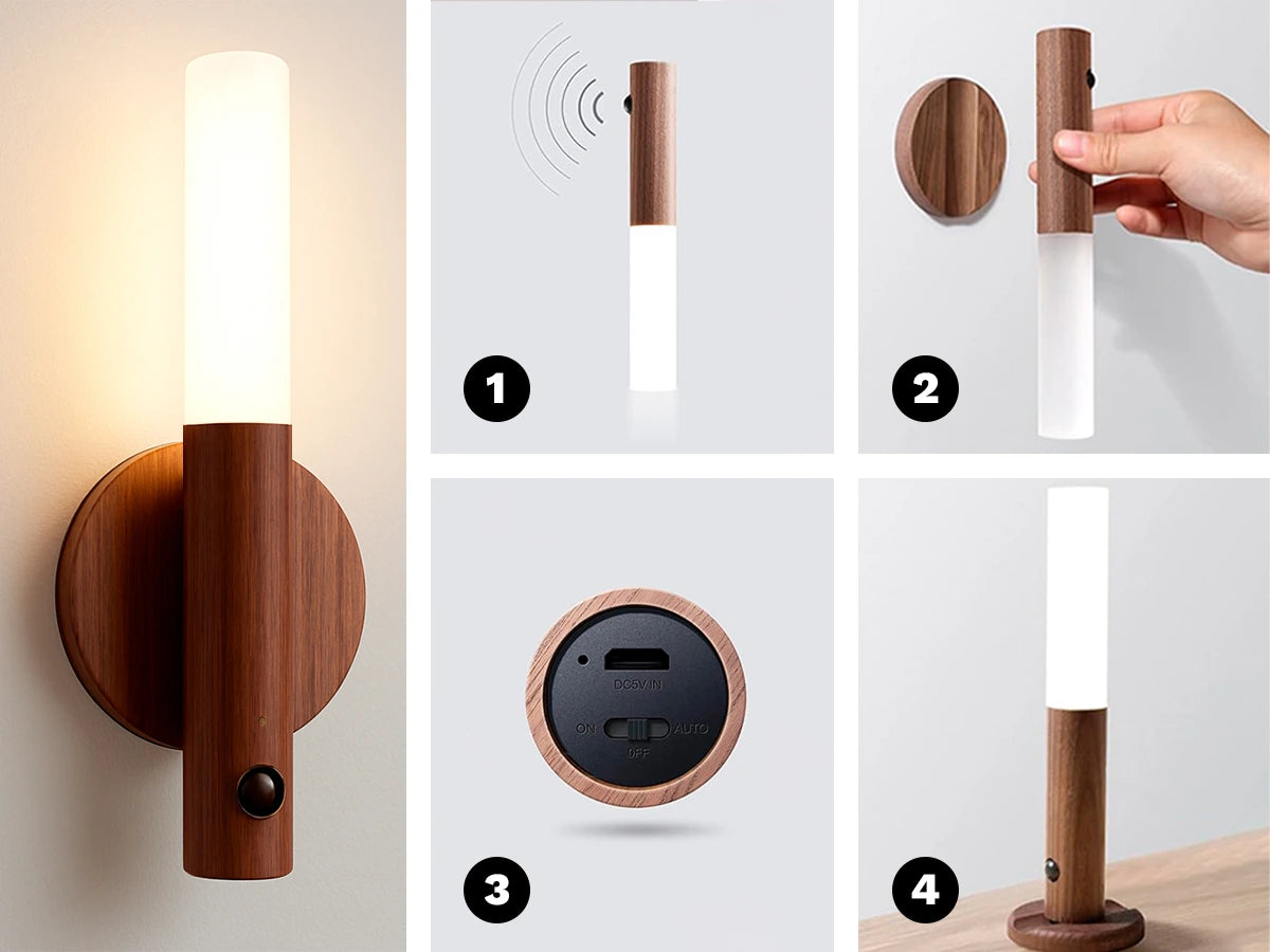 Olvídate de buscar el interruptor. Esta lámpara LED con sensor de movimiento ilumina tu camino al instante, detectando tu presencia sin necesidad de cables ni instalaciones complicadas. Su diseño en madera natural (nogal o fresno) crea un ambiente cálido y acogedor con una luz suave de 2700–3000K, perfecta para dormitorios, pasillos o cualquier rincón del hogar.